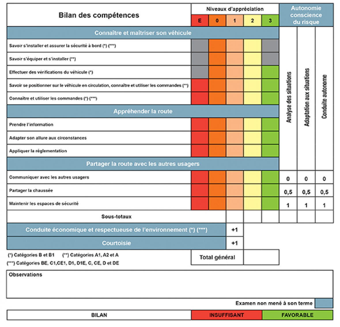 Le candidat devra démontrer sa capacité à évoluer sur la route en toute sécurité, en respectant les règles du code de la route, notamment celles soumises aux jeunes conducteurs, à respecter les autres usagers, notamment les plus fragiles (piétons et deux-roues etc...), et faire preuve de courtoisie. Il devra adapter son allure aux situations et s'assurer de ne pas gêner la circulation. Enfin il devra montrer sa conscience de l'environnement en adaptant sa conduite dans un souci d'économie de carburant et de limitation de rejet de gaz à effet de serre.