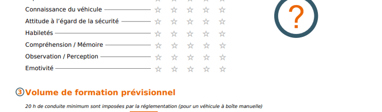 Grâce à des exercices pratique et des questionnaires permettant d'évaluer votre expérience de conduite, vos connaissances sur le véhicule, vos habiletés, vos compréhensions et mémoires, votre perception, votre émotivité et votre attitude à l'égard de la sécurité routière, cette évaluation va vous permettre de vous projeter dans un prévisionnel chiffré avec votre enseignant pour mieux vous situer dans votre plan de formation.